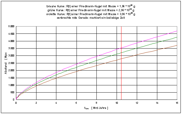 Die braune Kurve repräsentiert die kleinste und deshalb leichteste der hier gewählten Kugeln mit der Masse M = 1,96 * 1055 g. Sie dehnt sich nicht so schnell aus, wie die schwerste für diese Abbildung ausgewählte Kugel mit M = 3,96 * 1055 g (violette Kurve). Die grüne Kurve beschreibt eine Friedmann-Kugel mit der Masse M = 2,96 * 1055 g.