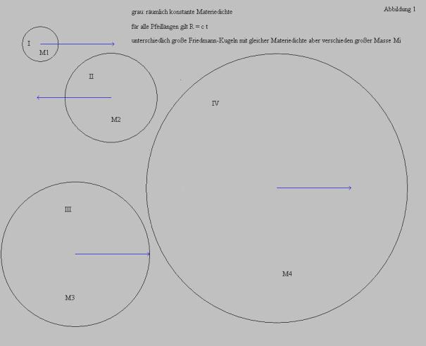 Die abgebildeten Kreise entsprechen Projektionen von 4 beliebig ausgewählten Friedmann-Kugeln mit entsprechendem Materieinhalt (Massen Mi) zu diesem Zeitpunkt t.