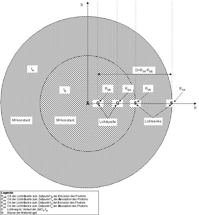 Der von den beobachteten Photonen zurückgelegte Weg, der als scheinbarer Abstand allein für die Abschwächung der Helligkeit verantwortlich ist, ergibt sich gerade aus der Differenz D = RSA - RQE (man beachte hierbei, daß R = RSA = DA der heutige Kugelradius ist, aber RQE der Ort der emittierenden Galaxie irgendwo innerhalb der Massenkugel zum Zeitpunkt tE!). Das Licht benötigt für diesen Weg eine bestimmte Zeit. Während dieser Zeit wächst der Radius R der Massenkugel gemäß der Friedmann-Gleichung. Durch diese Expansion, die zeitlich parallel zur Photonenwanderung abläuft, wird die im Teil I der Aufsatzreihe behandelte Rotverschiebung erzeugt.